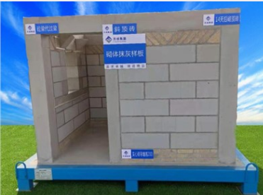 展示工藝:墻體砌筑、包含墻體砌筑、粉灰,根部預(yù)先澆筑200高的C20素混凝土墻基,包含混凝土反坎及鋼筋支模展示,砌體抹灰,樓面防水,H型立管排水管道展示,煙道反坎,門洞缺口梁,線盒、等電位端子箱預(yù)埋等工藝。